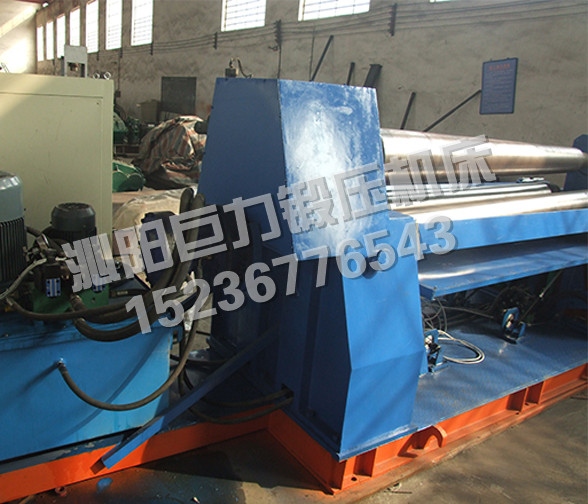 該機型的上輥固定,兩下輥呈傾斜狀做旋轉(zhuǎn)運動,兩下輥可以同時升降,也可以單升單降,用以完成板材的端部預(yù)彎。