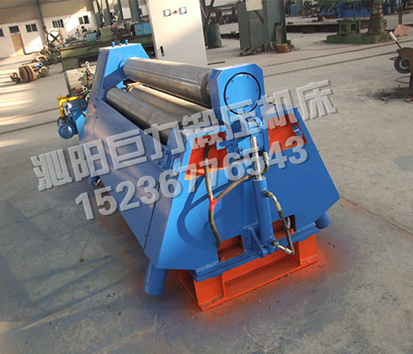 該四輥卷板機(jī)與對稱三輥卷板機(jī)比較,它可以不借助其它設(shè)備模具,直接予彎板材端部,而且剩余直邊較??;它可以不使板材調(diào)頭,而卷成工件。